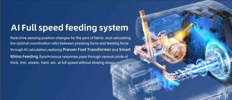 Advanced high speed digital sewing machine (7000rpm) with voice guide. Light / Medium / Heavy Duty digital selector; Automatic recognition of materials and thicknesses; Digital presser foot lifter; Short cut; Photocells for automatic sewing.
