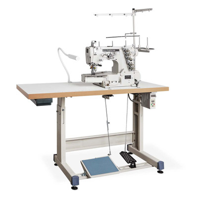 The 2100IF flatbed coverstitch machine with Direct Drive technology offers 2 or 3 needle options for hemming or cover seaming, eliminating belt replacement, providing precise speed control, and featuring user-friendly elements like an easy-to-thread looper, leak prevention, material release mechanism, and safety guards.
