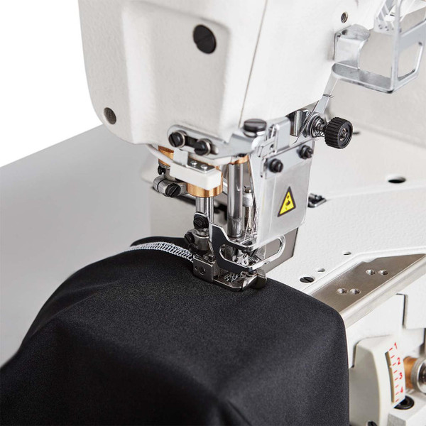 The 3100IC cylinder coverstitch machine with advanced Direct Drive technology provides the flexibility of using either 2 or 3 needles for hemming or for cover seaming. Direct Drive means there’s no more belt to replace and you get the most accurate speed control to fit every level of sewer’s needs. With easy to thread looper, no stain seal to trap and prevent oil from leaking, built-in release mechanism to allow for easy removal of the material and an eye and needle guard for your safety.